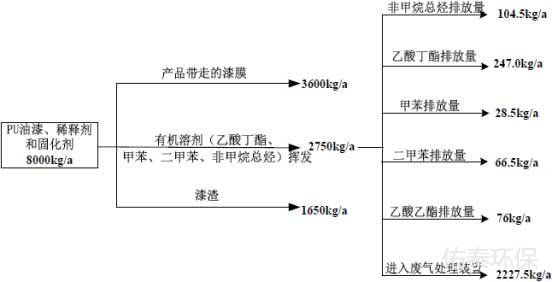 達產(chǎn)情況下PU油漆年用量為5t、稀釋劑年用量為1t、固化劑年用量為2t,按含量計算易揮發(fā)物質非甲烷總烴0.550t/a、乙酸丁酯1.30t/a、甲苯0.150t/a、二甲苯0.350t/a、乙酸乙酯0.40t/a,其他為樹脂等固化劑。根據(jù)噴油漆涂料用量核算表(表2-4),噴漆進入產(chǎn)品的量為3.600t/a。PU油漆、稀釋劑和固化劑物料平衡情況見圖2-1。