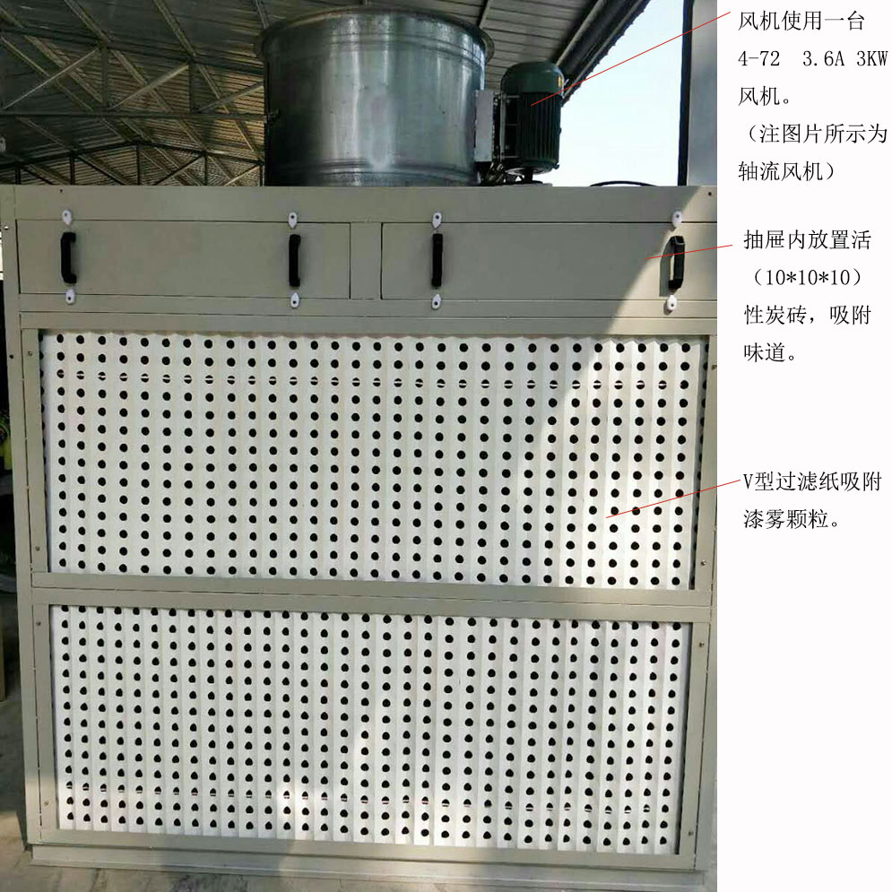 噴漆時(shí)所產(chǎn)生的漆霧顆粒,在風(fēng)機(jī)的吸力下,漆霧顆粒首先通過(guò)一級(jí)過(guò)濾(漆霧過(guò)濾棉、V型過(guò)濾紙、迷宮紙盒),大部分漆霧顆粒被截留在吸附介質(zhì)上面,剩下部分細(xì)小顆粒經(jīng)過(guò)纖維過(guò)濾棉進(jìn)行二次過(guò)濾,經(jīng)過(guò)二級(jí)過(guò)濾后,漆霧凈化效果達(dá)90%以上,處理后的廢氣通過(guò)廢氣處理設(shè)備(活性炭吸附箱、光氧催化、催化燃燒裝置)凈化后達(dá)到高空排放標(biāo)準(zhǔn)。