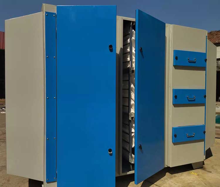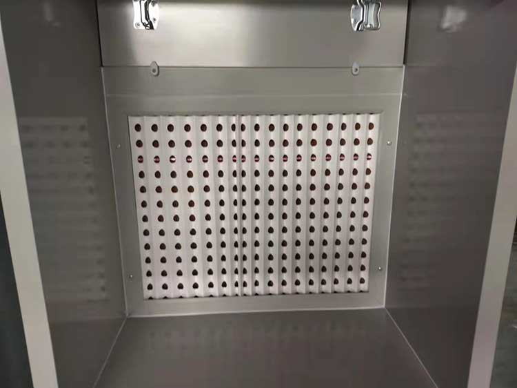 使用干式噴漆柜的噴漆室,因?yàn)槠浞蛛x漆霧的過程中不使用水,純干式的方式分離漆霧,故稱為干式噴漆室。干式噴漆室按照分離漆霧的形式可以分為以下幾種類型:折流式漆霧捕集箱式干式噴漆室、石灰式干式噴漆室、靜電式干式噴漆室,漆霧氈式干式噴漆室,風(fēng)琴紙式。