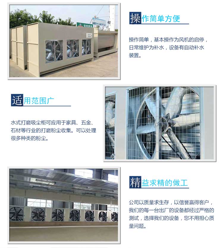 3、工作原理:產(chǎn)品打磨產(chǎn)生的粉塵,經(jīng)過風(fēng)機(jī),吸附到打磨柜里面,通過里面的水循環(huán),落到打磨柜的下面。